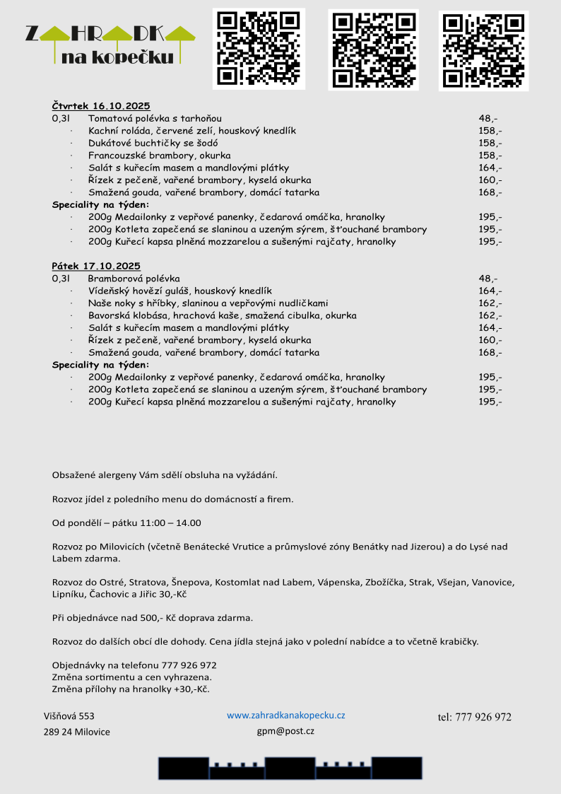 - Rozvoz po Milovicích (včetně Benátecké Vrutice a průmyslové zóny Benátky nad Jizerou) a do Lysé nad Labem zdarma.